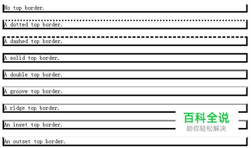 <html> <head> <style type="text/css"> p { border-style:solid; } p.none {border-top-style:none} p.dotted {border-top-style:dotted} p.dashed {border-top-style:dashed} p.solid {border-top-style:solid} p.double {border-top-style:double} p.groove {border-top-style:groove} p.ridge {border-top-style:ridge} p.inset {border-top-style:inset} p.outset {border-top-style:outset} </style> </head> <body> <p class="none">No top border.</p> <p class="dotted">A dotted top border.</p> <p class="dashed">A dashed top border.</p> <p class="solid">A solid top border.</p> <p class="double">A double top border.</p> <p class="groove">A groove top border.</p> <p class="ridge">A ridge top border.</p> <p class="inset">An inset top border.</p> <p class="outset">An outset top border.</p> </body> </html>