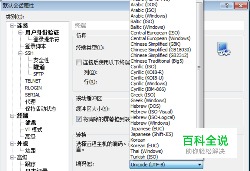 在属性对话框中的类别中选择选择“终端”,在选择栏的右侧的“编码”中修改,即可更换之前的xshell编码。效果如图所示