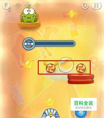 《割绳子玩穿越》是一款很经典的休闲类小游戏,玩家被游戏中的简单风格及各种关卡所吸引,玩家们都迷上了这款游戏。但是,玩家在玩到第4—11关时,碰到了很多小问题,下面小编为大家分享割绳子玩穿越第4—11关详细图文攻略。 1、当两个糖果在移动在下图红色框中的时候,点击蓝色按钮,让它们停止。 2、把上方的滑轮向右移动,让绳子牵住右边的糖果并被泡泡包裹,如下图所示。 3、点破泡泡,割断绳子即可过关。 以上就是《割绳子玩穿越》第4—11关详细图文攻略分享,希望能帮助更多的玩家,让玩家顺利通过此8关。