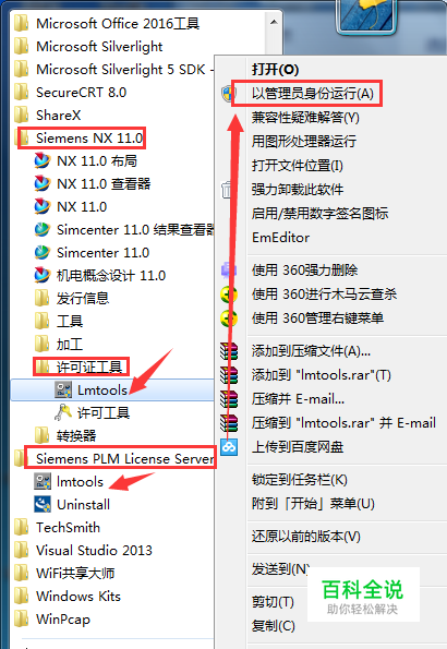 首先找到许可证服务管理程序“ lmtools”,并以管理员身份运行。 图中2个路径均可。