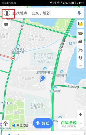 第一步在我们的手机上面打开地图软件,进去主界面之后,点击左上方的个人头像,如下图所示: