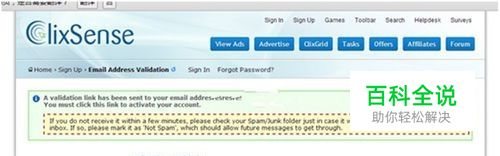 填完个人注册信息后点击Signup Now 然后出现和下图一样的网站告诉你已经向你注册Clixsence的邮箱发送了帐号激活网址,你要到邮箱里去找到这个网址