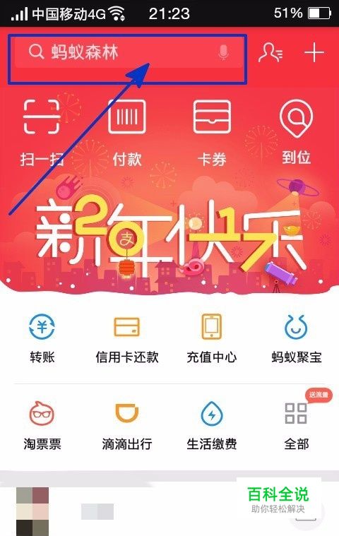 我们先打开支付宝,进入到支付宝主页。在主页我们看到最上边有搜索。