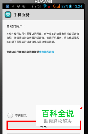首先我们还是先在手机上找到手机服务的软件,然后进入其中。大家可以看到在进入手机服务的时候会提示说:需要流量,并且使用该应用就表示同意接受华为隐私政策。这里我们直接点击“确定”就好。
