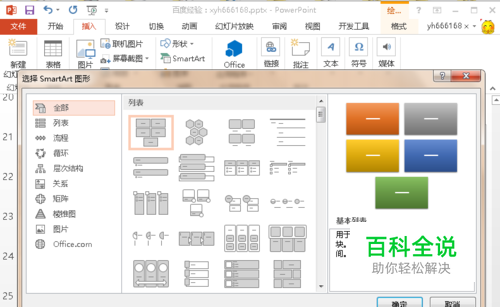 选择我们要插入到幻灯片文档的图形,然后点击右下角的确定按钮,这样就将我们选择的smarttart图形插入到幻灯片文档中了