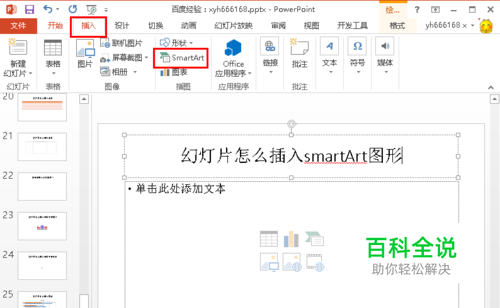 首先打开幻灯片软件,然后在菜单栏中点击“插入”,打开插入工具栏,之后在插入工具栏中点击smarttart,如下图所示