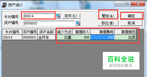 进入卡片--资产减少,参照卡片编号,点击“增加”按钮,录入信息。点击“确定”按钮。