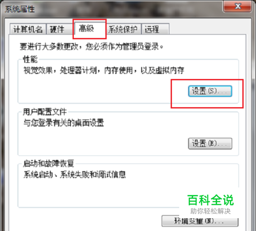 第二步进去系统属性后,在性能那里选择“设置”,如下图所示: