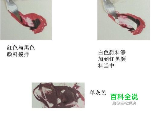 然后把把黑色颜料添加到红色颜料当中并且搅拌均匀,变成红黑色。接着再添加白色颜料到红黑颜料当中并搅拌均匀。