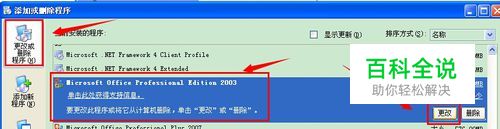 在“更改和删除程序”中找到“Microsoft Office Professional Edition 2003”,点击“更改”: