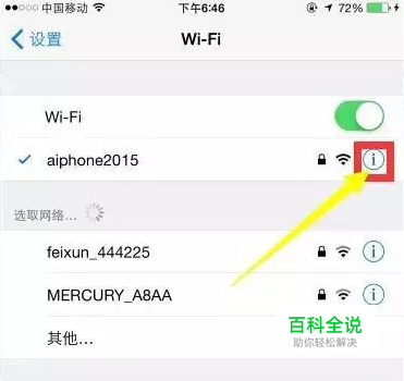 方法仍然是,进入手机的设置、Wi-Fi(局域网)、然后点击你原来用的Wi-Fi后面的蓝色感叹号。