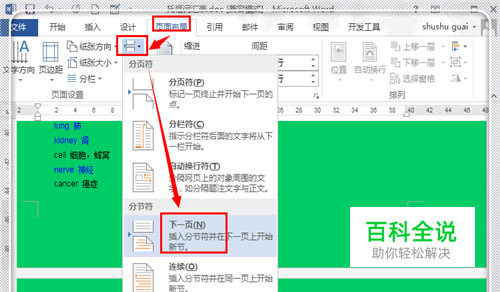 点击菜单栏的“页面布局”,然后点击“分页符”,在分页符下面弹出的功能选择中,点击“下一页”。