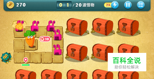 19波怪物也可以轻松搞定. 20波怪物来的时候注意先把前面的小怪物通通消灭掉, 这个时候大BOSS基本上已经走到中间了,这个时候暂停游戏,把顶部的便便卖掉换成飞机,集中攻击.最后金萝卜就可以拿到手了.