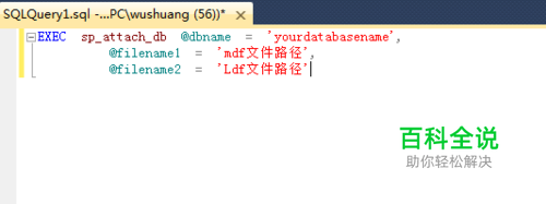 再代码界面输入如下代码,点击F5键或者点击运行按钮即可。 代码如下: EXEC sp_attach_db @dbname = '你的数据库名', @filename1 = 'mdf文件路径(包缀名)', @filename2 = 'Ldf文件路径(包缀名)'