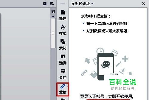 随便打开一篇WPS文档,点击右侧的三角形符合,弹出隐藏栏。然后点击“发射”,就可以找到登录的入口了。