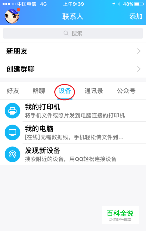 打开手机QQ,点击联系人,并选择“设备”选项。