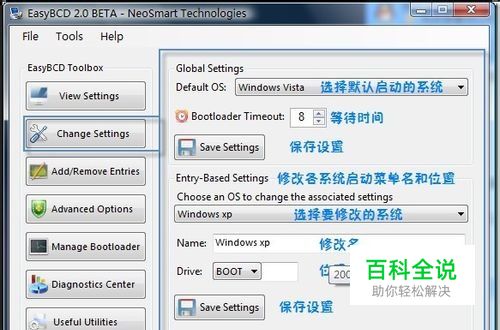 2.在Chang Settings里可以修改你需要设置默认启动的系统,和启动菜单的名字。有时候添加启动项之后,在View Setting里看到系统所在的盘符没有识别正确,在这里可以修改。安装完xp再安装vista/7会把xp的启动项识别为较早的windows,在这里也可以该过来。