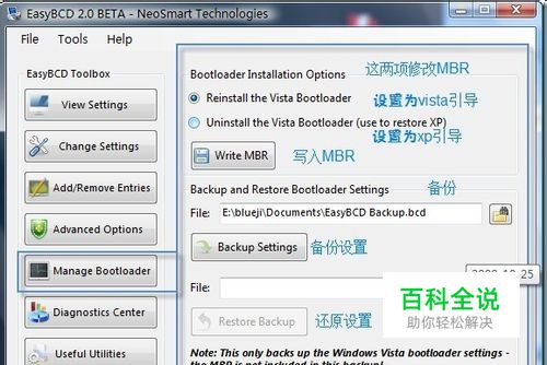 5.这里也是比较实用的功能,第一项是修改MBR,将引导方式修改为vista/7或者xp。和bootsect.exe工具一样(bootsect.exe介绍见最后)注意修改这里会使vista/7的软激活失败,(重新启动重新使用工具就可以修复)还有利用这个可以修复使用安装mac os时的boot 0 error问题。第二个是备份设置。修改之前推荐先备份。