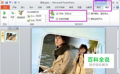 点击“插入”→ “音频”→ 然后插入音乐文件。再点击“音频工具”→“播放”,设定音乐的“播放效果”、放映是否隐藏等参数。
