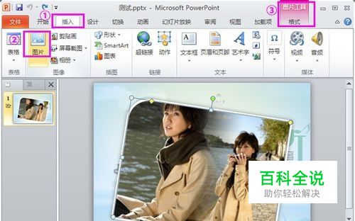 运行PPT软件,新建一个幻灯片,由于是加一张图片我就建立一张就可以了。这里的背景是以图片展示,也可以只用颜色。点击“插入”→ “图片”,把要加音乐的图片添加进来。