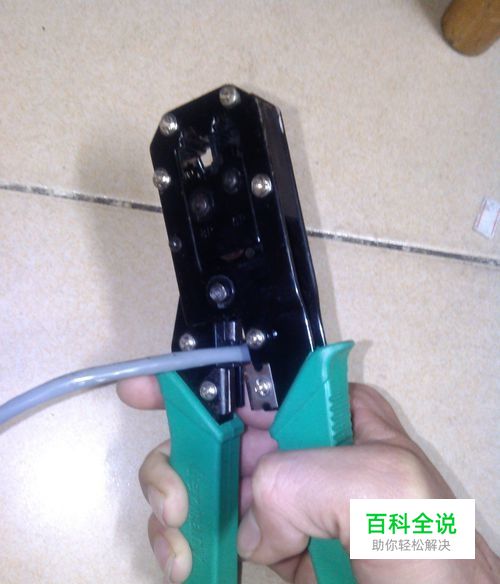 接下来我们把它插入网线钳的网线压线口,(一般网线钳都有两个压线口,一个制作电话线接头,一个制作网线接头)然后用力压下网线钳手柄,直至不能再压下。这样我们就做好了一端的网线接口,另一端制作方法同这个一样。