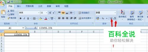 打开excel软件,随便输入一个数字比如123456.234,正常没设置的时候,是输入几位小数,就显示几位。在如下图箭头标示的地方,可以直接增加小数位数,一个是增加一个是减少,比如点击 减少小数位数 就会减少一位。