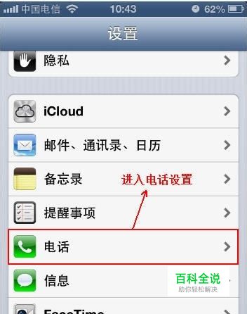 第一步,找到iPhone手机里面的设置选项,点击电话,进入电话设置选项,具体如下图所示: