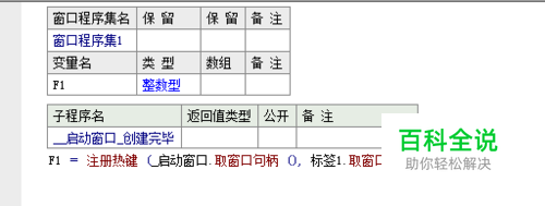 界面好了之后,进入窗口程序集,写代码 需要变量,和注册按键,按键可以选你自己喜欢的,小编用的是F1键 .版本 2.支持库 shellEx.程序集 窗口程序集1.程序集变量 F1, 整数型.子程序 __启动窗口_创建完毕F1 = 注册热键 (_启动窗口.取窗口句柄 (), 标签1.取窗口句柄 (), 0, #F1键)