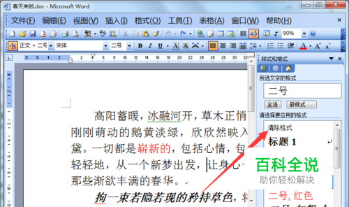 这时我们在word窗口的右侧就会出现一个“样式和格式”窗格,在窗格中我们会看到有一个“清除格式”点击即可。(前提记得选中需要清除的文档内容)