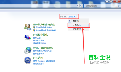 打开控制面板之后,如果是以类别显示的,则点击右上角的查看方式,然后选择大图标。