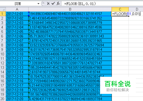第二步:在旁边单元格式中输入公式:=FLOOR(B1,0.01) 注:B1单元格必须为数值型,0.01意思是取小数点后两位。