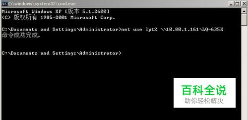 打开提示符窗口输入如图命令并执行: 命令格式:net use ltp2 \\IP地址\打印机名