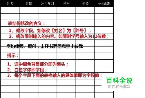 修改表结构,必须先弄明白什么是表结构: 1、表结构就是表的基本结构,想一想一张表里面,哪些部分规定着表的基本结构? 2、就是表头部分,如常见的【姓名】、【性别】、【学号】等; 3、vfp中,表头的每一个单独部分被称之为“字段”。如【姓名】就是一个字段; 4、表结构的修改主要涉及两个内容: (1)字段的修改。如把【学号】修改为【学生证号】; (2)字段值内容输入的限制。如性别只能输入“男”或“女”;