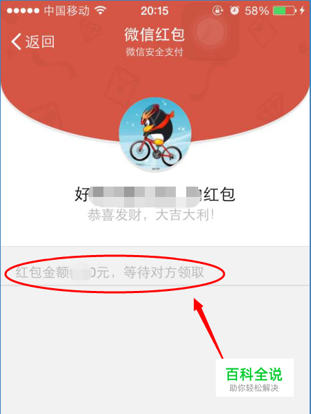 发送以后,点开刚刚发的好友,我们会看我们刚刚发送的红包,点开发送的红包也会看到”红包金额多少多少,等待对方领取“。