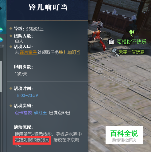 逆水寒走路如银铃般的人是谁呢?怎么找到她呢?铃儿响叮当任务怎么做?攻略如下: