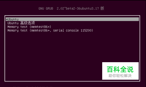 系统启动后,在BIOS引导界面按“ESC”键进入选择菜单,选择第一个“Ubuntu”,按“e”键进入编辑模式。