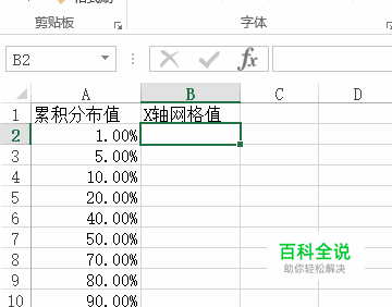 首先要做的是绘制正态分布刻度。 打开2013版excel,按自己的需要输入一系列累积分布值。在”X轴网格值“那一列的第二个单元格中插入公式"NORM.S.INV"。在弹出的窗口的"probability“处选一开始输入的系列累积分布值,选确定,空格,填充柄下拉,即得到正态刻度数值。