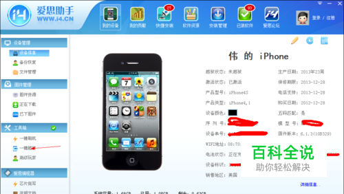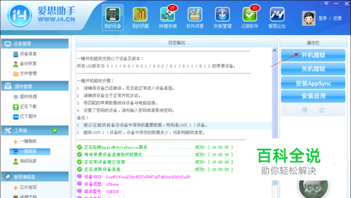 手机连接电脑,打开 爱思助手, 点击一键越狱 ,箭头处。