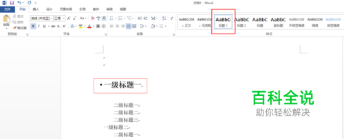 将光标放置在一级标题文字的那一行,点击右上部分的标题1,文字自动形成标题1的格式