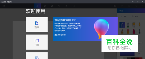 进入“画图 3D”的应用界面之前,先显示“欢迎使用”的界面,点击“新建”按钮启动一个新的项目。