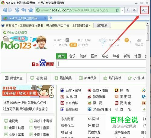 首先我们打开世界之窗浏览器,然后点击浏览器右上角的扳手符号后面的倒三角符号 如图