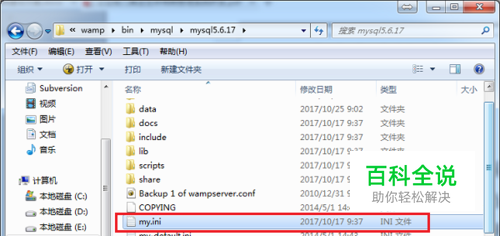 第二步进去之后可以看到my.ini在mysql安装路径的根目录,这是其中一种情况,如下图所示: