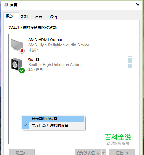 如果有需要,可以将不适用的声音设备进行禁用,如需恢复可以在播放标签下的空白处右键点击,选择显示以禁用的设备,然后在以禁用的设备上右键点击启用即可。