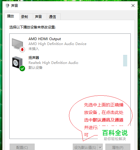 看到声音设置界面后,点击 播放标签。选择以下播放设备来进行修改设置。 并将其设置为默认播放设备及通讯设备并保存即可。