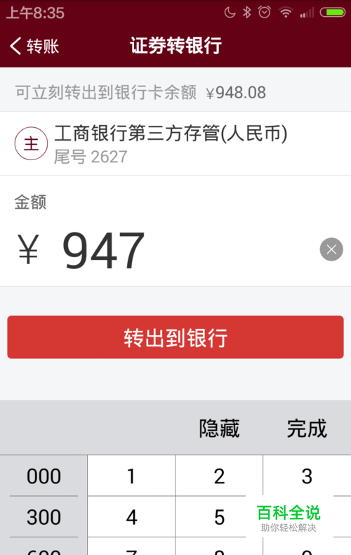 输入转账金额,账户里面一般要预留一块钱以便于资金清算。点击转出到银行。