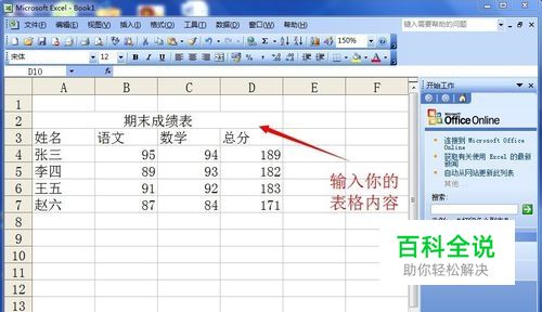 表格内容输入完成以后,用鼠标拖拽你想制成图表的区域,在举例中,包括姓名,语文成绩,数学成绩和总成绩。如图所示。