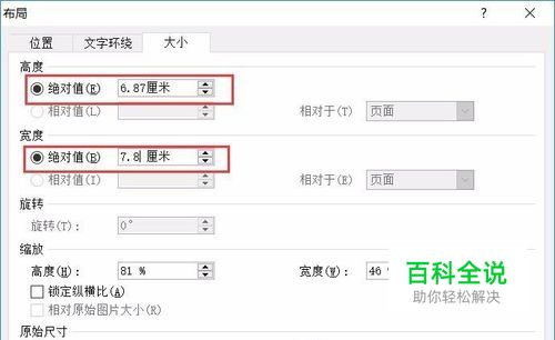 在”大小“选项卡中,取消”锁定纵横比“前复选框的选中状态,高度设置为” 绝对值“、”6.87cm“,宽度设置为” 绝对值“、”7.8cm“,单击”确定“按钮