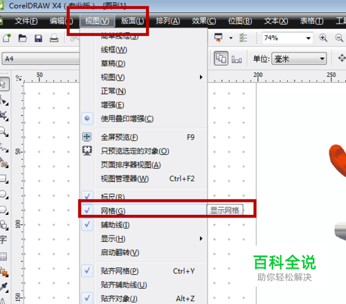 首先我们可以通过菜单栏中的【视图】里边的【网格】来确定自己是否来显示或者隐藏网格,【网格】前边对勾即为显示,无则为隐藏。