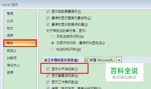 Excel选项中,选择“高级”,找到“此工作簿的显示选项”,勾选“显示水平滚动条”。
