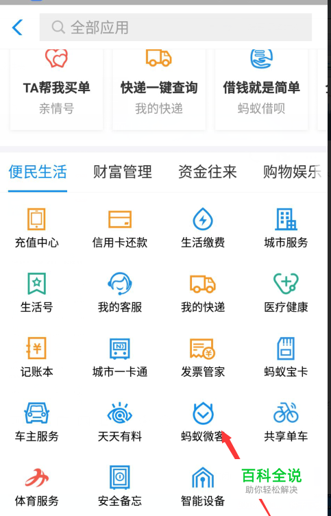然后在支付宝首页中找到便民生活---蚂蚁微客。(如图)